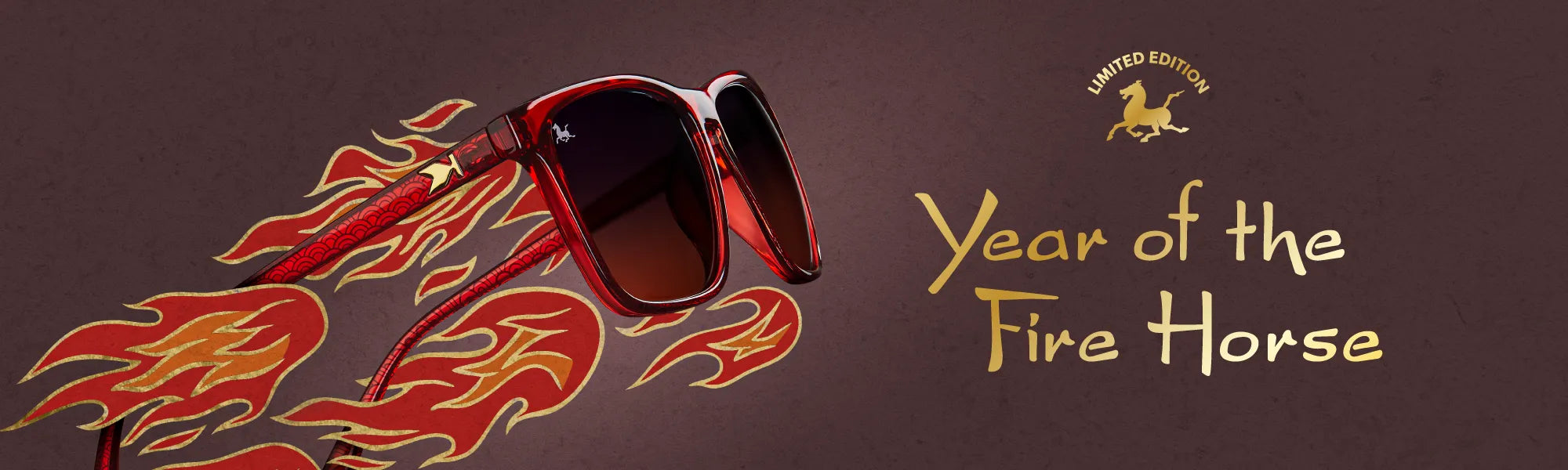 Every sixty years, the Fire Horse returns—powerful, untamed, impossible to ignore. These Year of the Fire Horse Fast Lanes feature deep translucent red frames ignited with bright gold accents and ember gradient lenses that fade like fire at dusk. Etched with the Fire Horse, a symbol of power, momentum, and fearless motion. Made for bold starts and unstoppable energy.