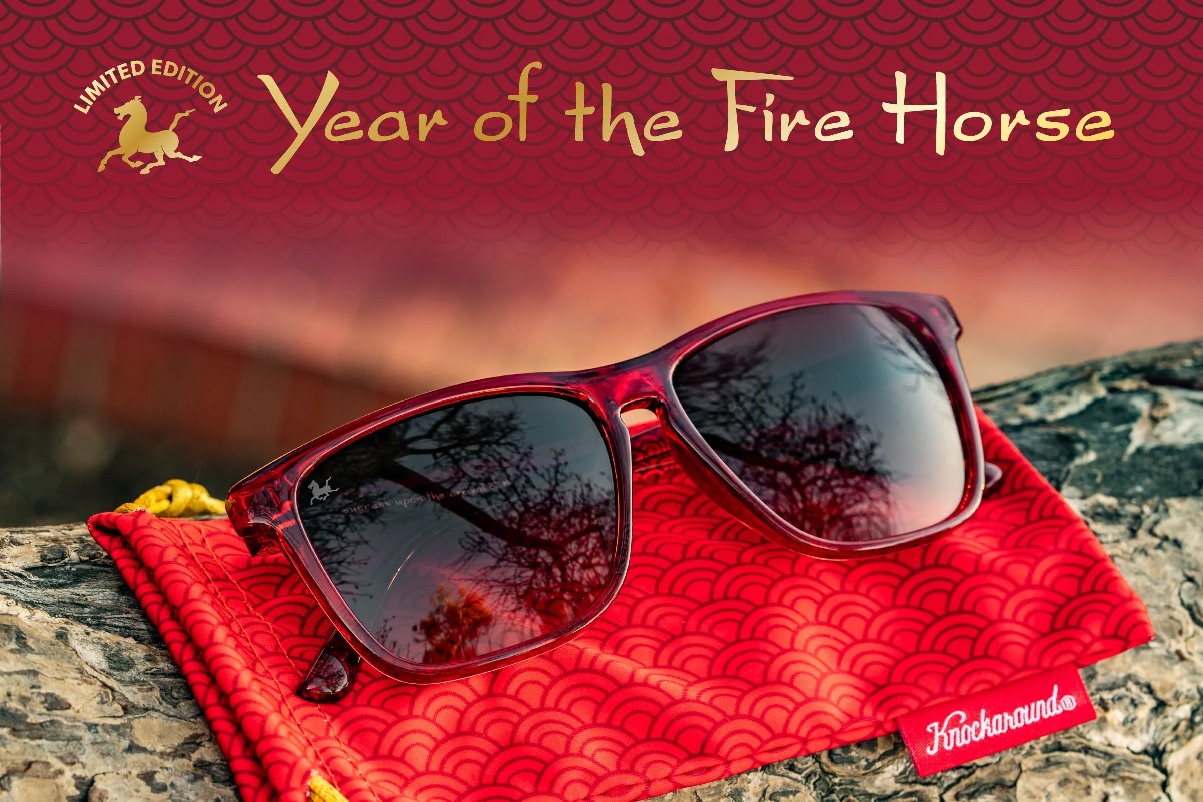 Every sixty years, the Fire Horse returns—powerful, untamed, impossible to ignore. These Year of the Fire Horse Fast Lanes feature deep translucent red frames ignited with bright gold accents and ember gradient lenses that fade like fire at dusk. Etched with the Fire Horse, a symbol of power, momentum, and fearless motion. Made for bold starts and unstoppable energy.